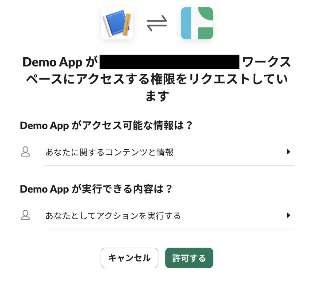 権限を追加したら「Install to Workspace」をクリックしてアプリをインストールします。